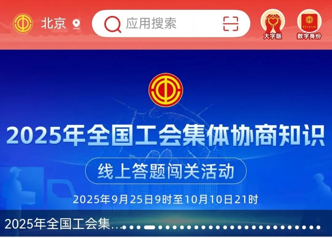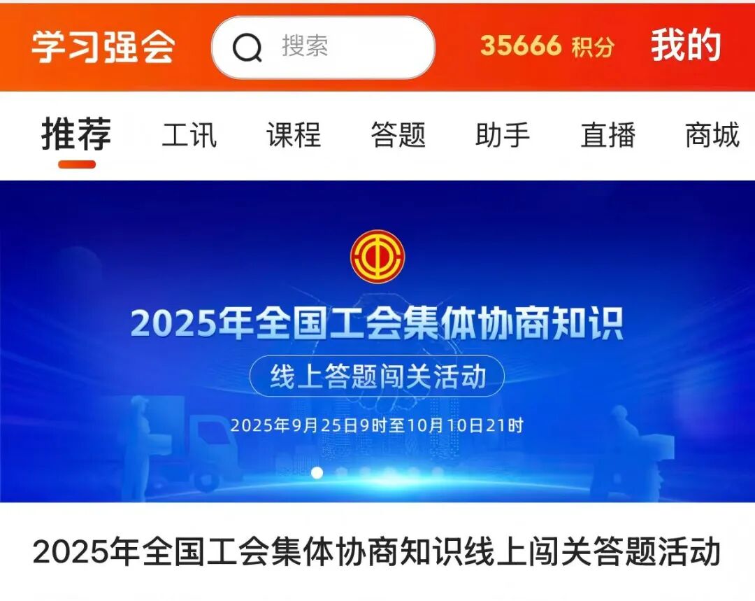 全面学习贯彻习近平新时代中国特色社会主义思想和党的二十大和二十届二中、三中全会精神,深入贯彻习近平总书记关于工人阶级和工会工作的重要论述,加强宣传普及,提高社会知晓度,进一步加深全社会对工会集体协商工作的认识、理解和支持,全国总工会权益保障部主办,中国工人出版社承办的2025年全国工会集体协商知识线上答题闯关活动,于9月25日至10月10日在“职工之家”APP“学习强会”模块展开。