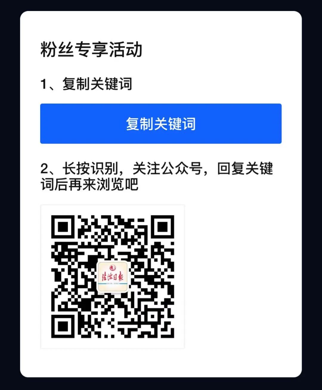 第二步:将复制的关键词发送至“法治日报微信公众号”对话框。
