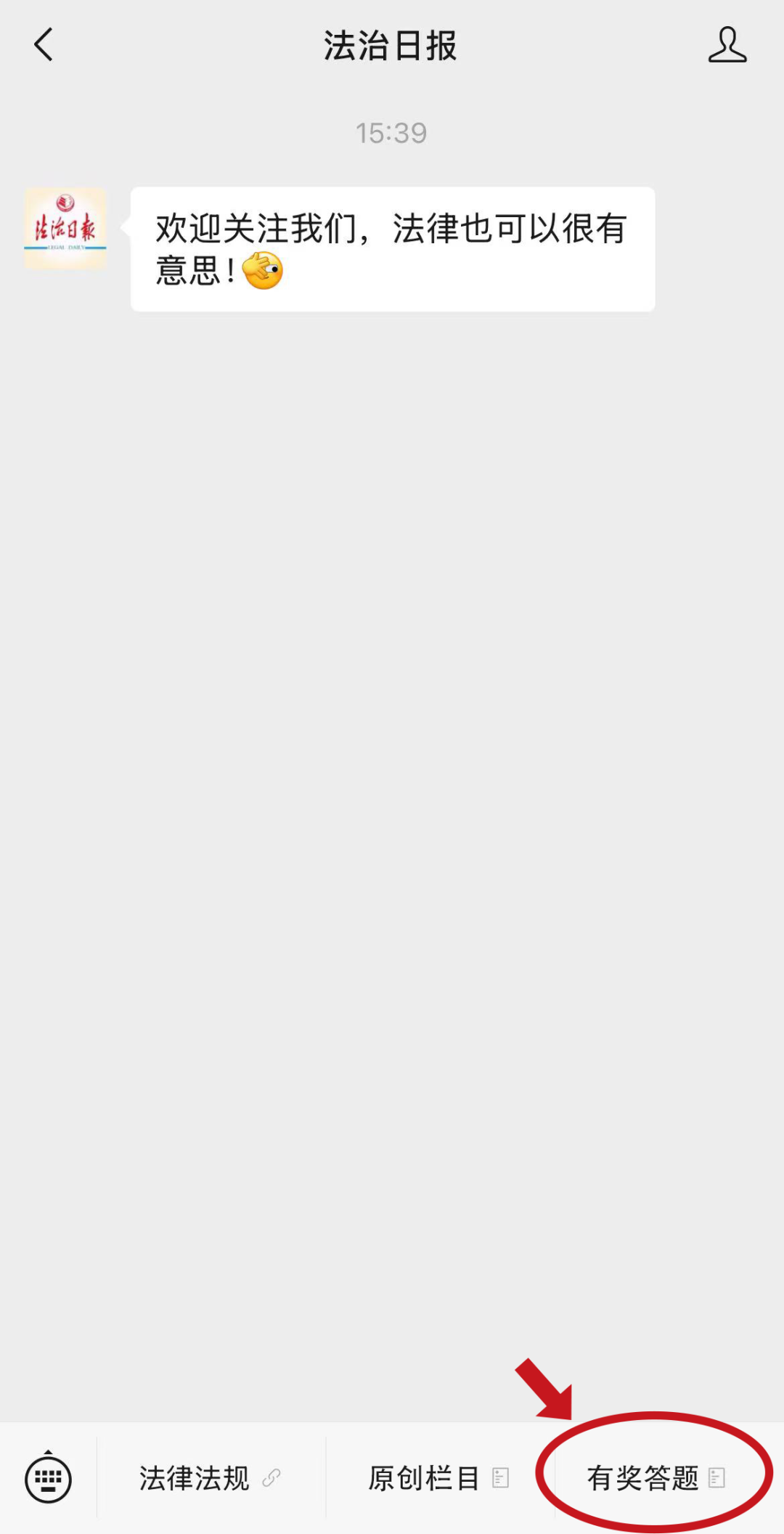 新微信用户首次答题,需关注“法治日报微信公众号,通过公众号底部菜单栏“有奖答题”或从每日公众号推送的答题文章进入答题页面。