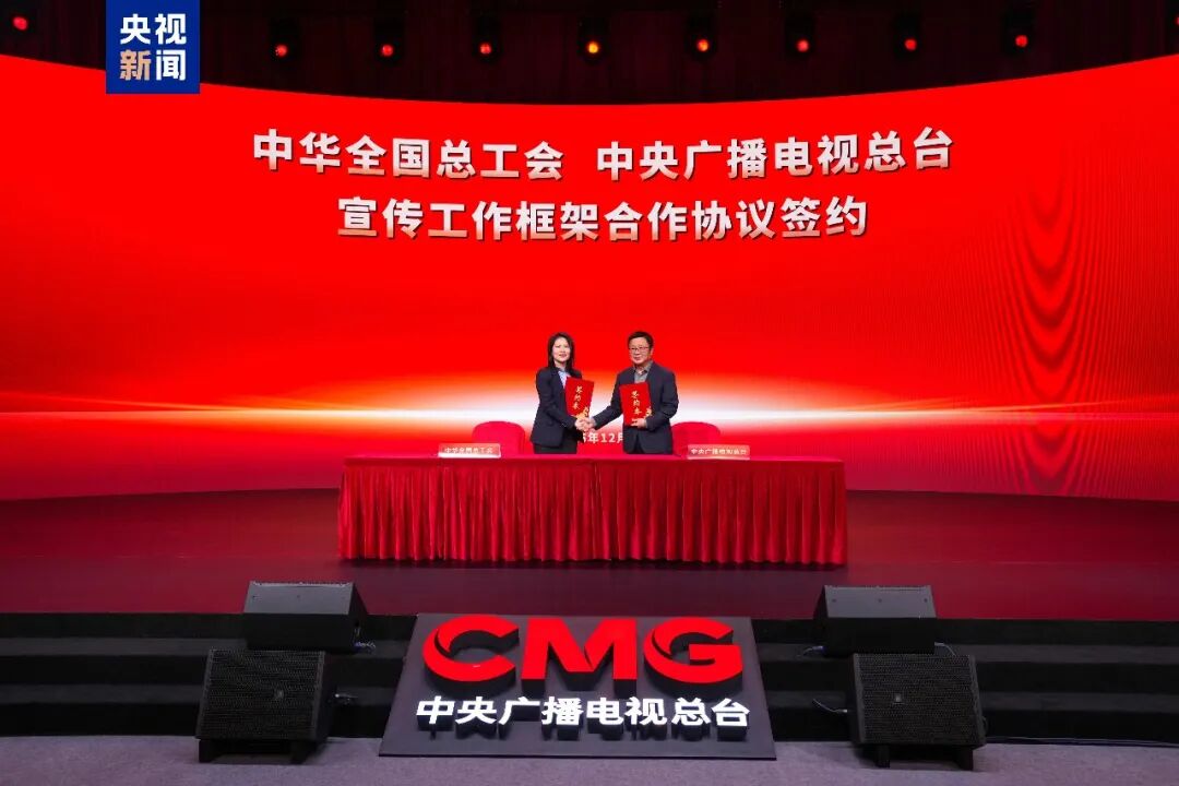 中华全国总工会宣传教育部部长徐璐与中央广播电视总台新闻中心主任申勇代表双方签署《中华全国总工会 中央广播电视总台宣传工作框架合作协议》