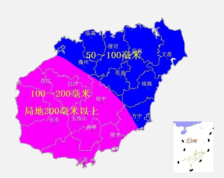 预计,6月11日08时~14日08时各地过程雨量:三亚、陵水、保亭、五指山、乐东、东方、昌江、白沙和琼中等市县100~200毫米,局地200毫米以上;儋州、临高、澄迈、屯昌、海口、定安、文昌、琼海和万宁等市县50~100毫米。