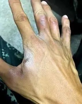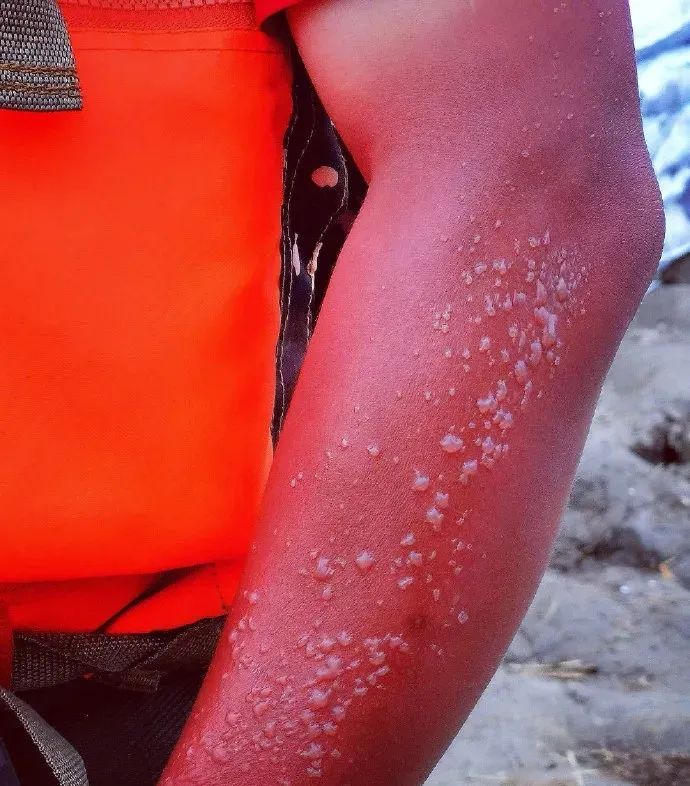 手臂上被晒出密密麻麻的水泡