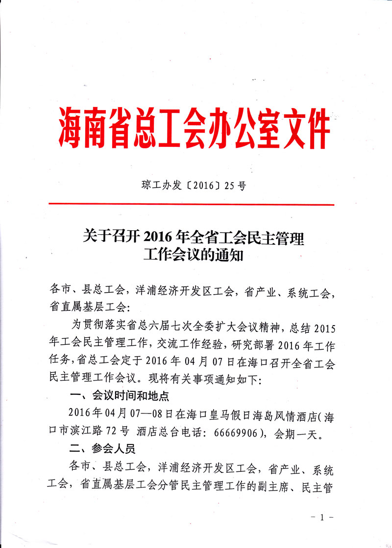 关于召开2016年全省工会民主管理工作会议的通知(琼工办发(2016)25号)